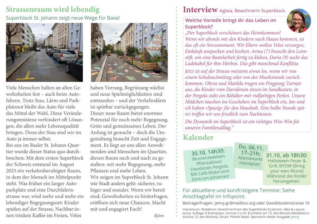 2 Monate sind seit der Eröffnung des Superblockperimeters am 16.8.2025 vergangen. Einiges ist in dieser Zeit passiert, obwohl sich wohl nicht wenige noch eine nachhaltigere und schnellere Transformation des öffentlichen Raums, der vor der Eröffnung mehrheitlich vom ruhenden und fliessenden motorisierten Individualverkehr genutzt wurde, wünschen. Aber, es gibt auch Menschen, die genau das nicht möchen und die Interessengegensätze müssen ausgehandelt werden.