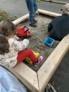 Nach und nach werden “Aufenthaltselemente” verbessert (Boulebahn) oder lang ersehnte eingerichtet (Sand für den Sandkasten bei den Kindern)