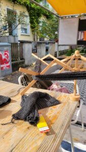 Ein schöner Nachmittag, mit Sonne in guter Gesellschaft. Wir haben erzählt, Wolle ‘geerntet’ (siehe Bild) und sind den Mottenlöchern mit Nadel und Faden zuleibe gerückt.