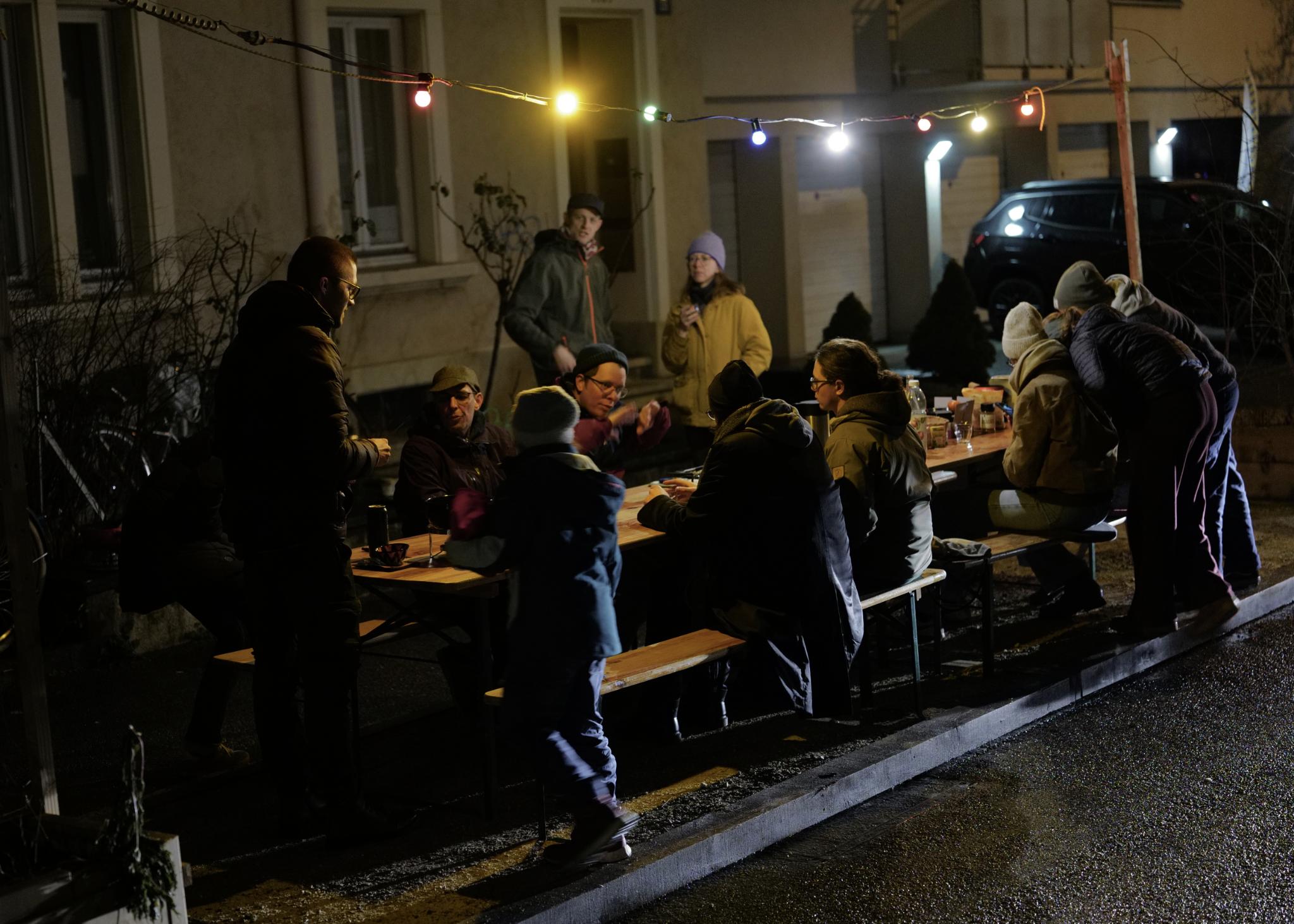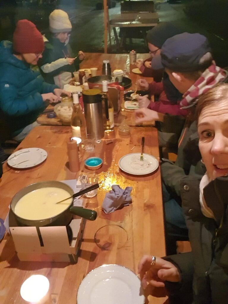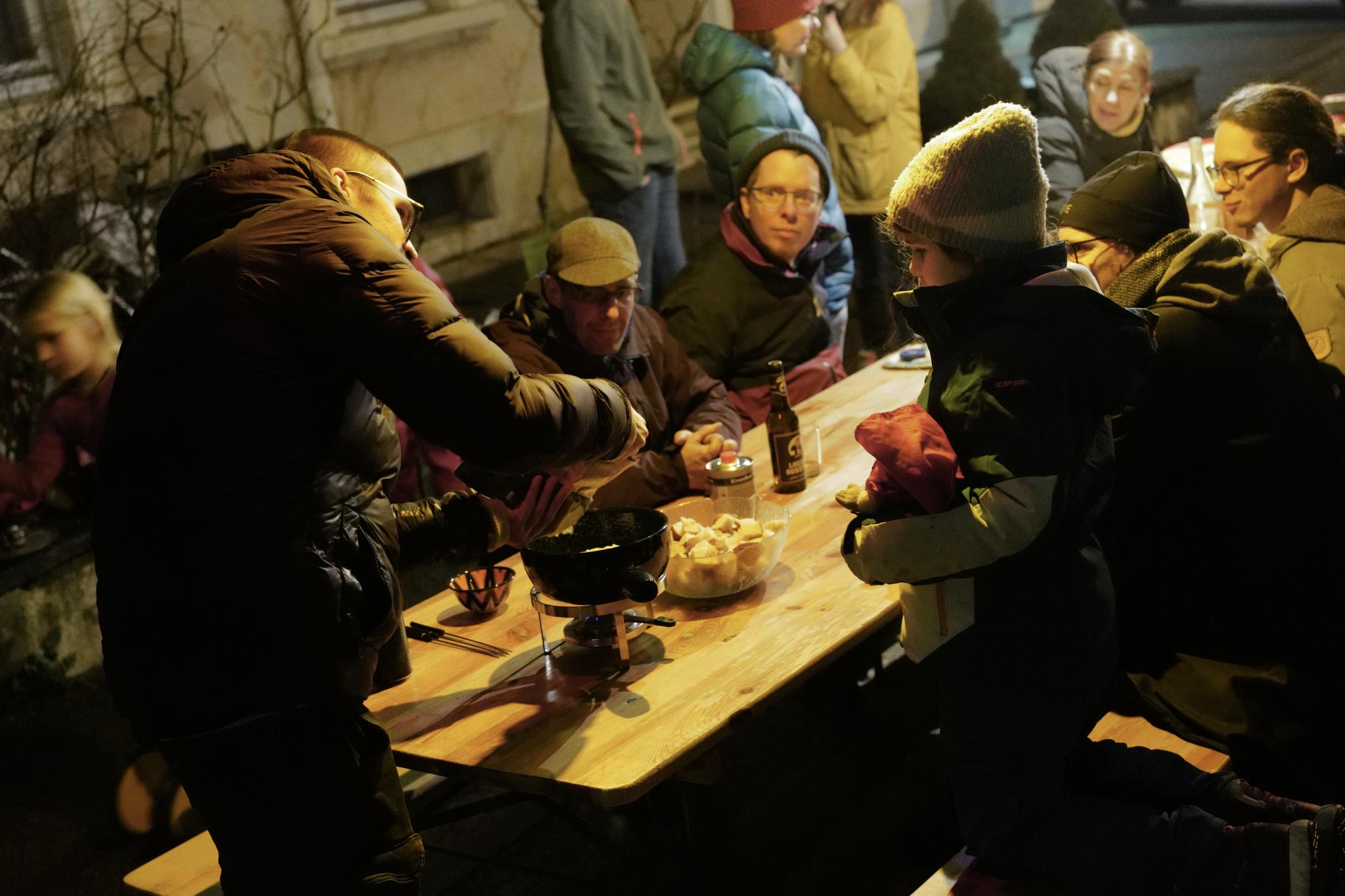 Fondueessen im Superblock trotz Nieselregen und nicht gerade wohligen Temperaturen