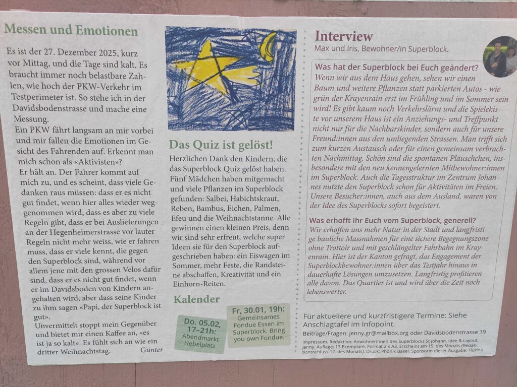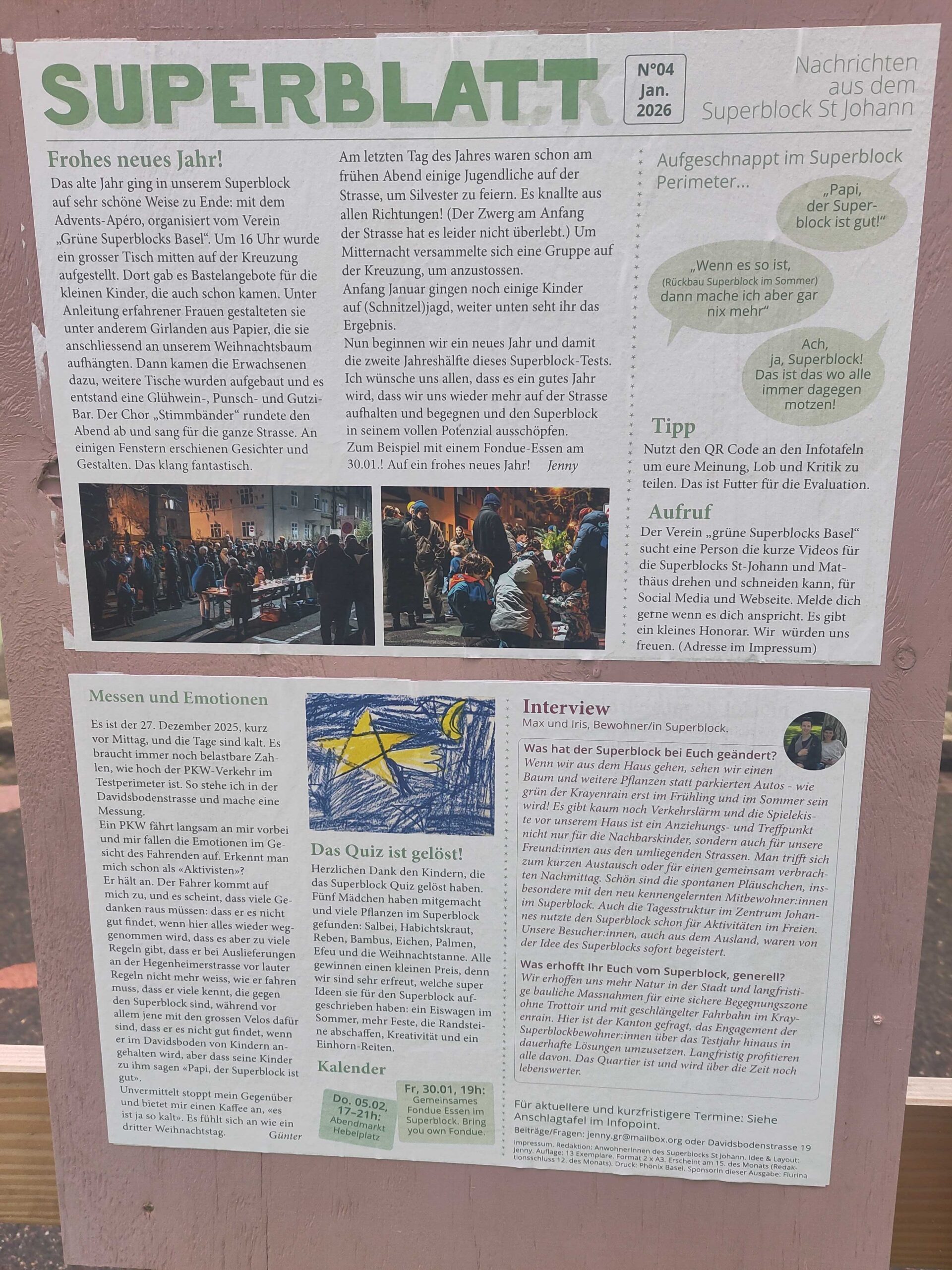 Wir werden unsere Kräfte im Neuen Jahr mit vielen anderen Menschen und Organisationen bündeln, damit die Absicht der politischen Gremien des Kantons, die Superblockprojekte im Matthäus und St. Johann bereits nach einem Jahr wieder zu beenden, was all das bisher positiv erreichte wieder komplett zurückdrehen würde, nicht umgesetzt werden kann.